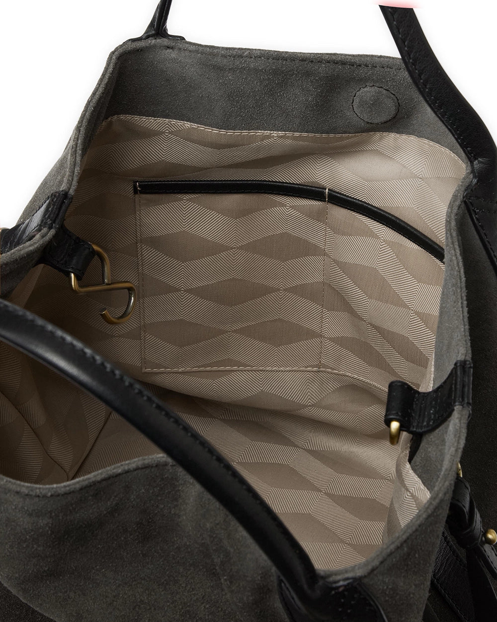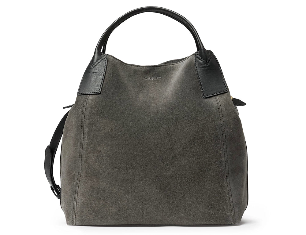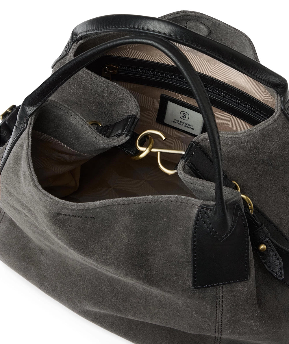 De långa handtagen i läder ger bekväm bärkomfort, medan kontrasten mellan läder och mocka skapar en exklusiv och modern känsla. Väskan levereras med en justerbar och avtagbar axelrem i läder (längd 99–120 cm), så du enkelt kan bära den både som handväska, axelväska eller crossbody.