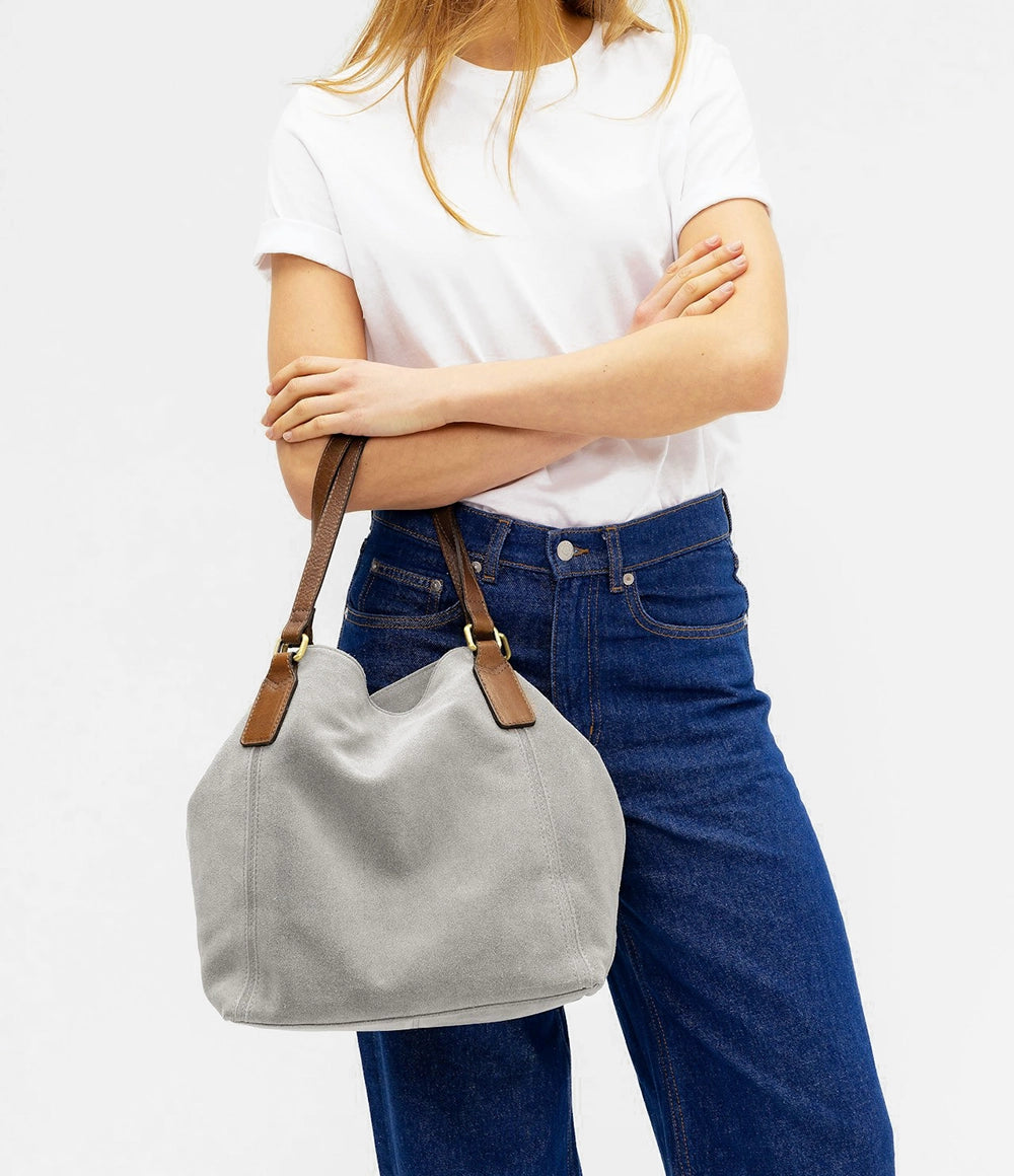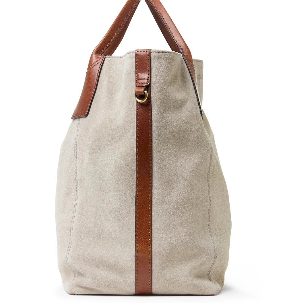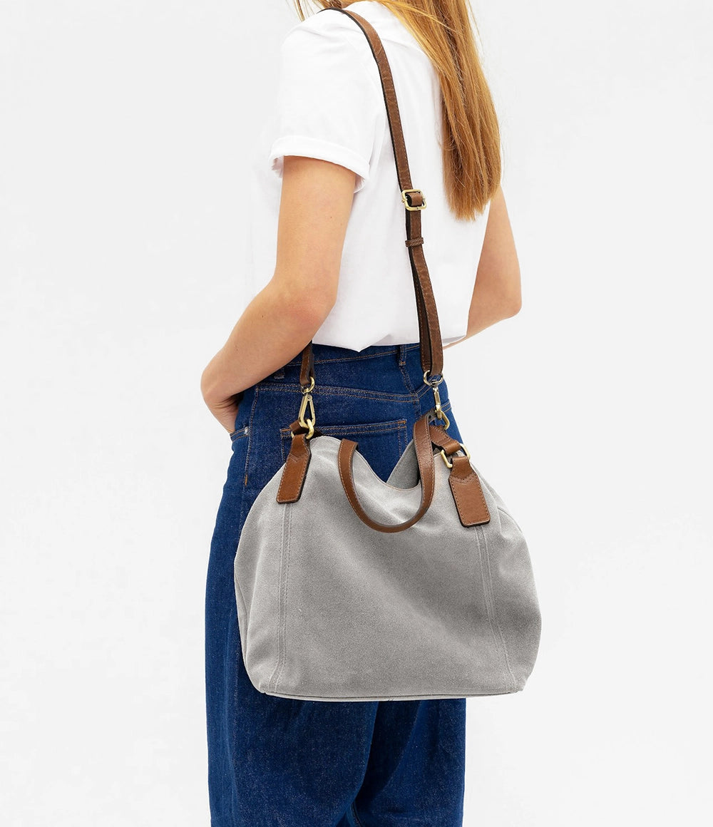 De långa handtagen i läder ger bekväm bärkomfort, medan kontrasten mellan läder och mocka skapar en exklusiv och modern känsla. Väskan levereras med en justerbar och avtagbar axelrem i läder (längd 99–120 cm), så du enkelt kan bära den både som handväska, axelväska eller crossbody.