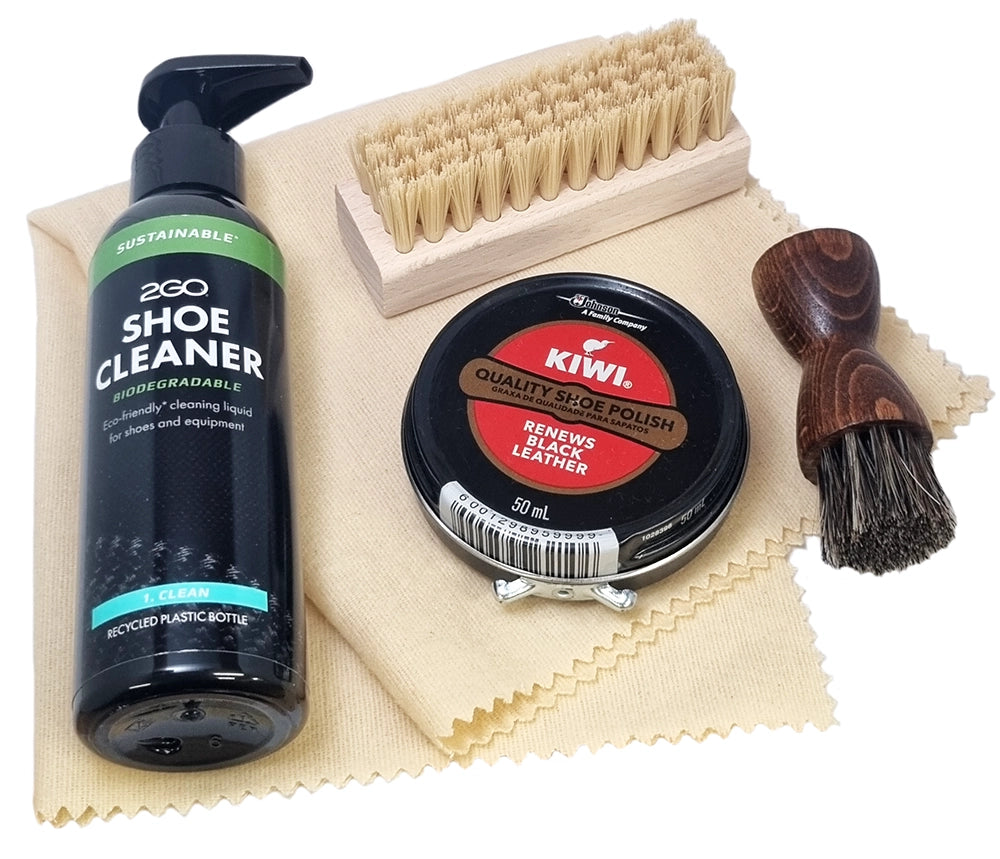 Vi har satt ihop ett litet prisvärt rengöringskit för skor. Det innehåller nödvändiga produkter för att göra rent och förlänga livet på dina skor; ett effektivt skorengöringsmedel, rengöringsborste, skokräm, samt en liten påföringsborste och en putsduk.